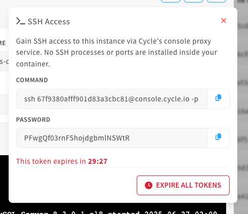 For users who have the capability enabled, access containers and VMs securely without managing keys or opening ports. Cycle generates short-lived SSH sessions through a hardened proxy with zero setup required.